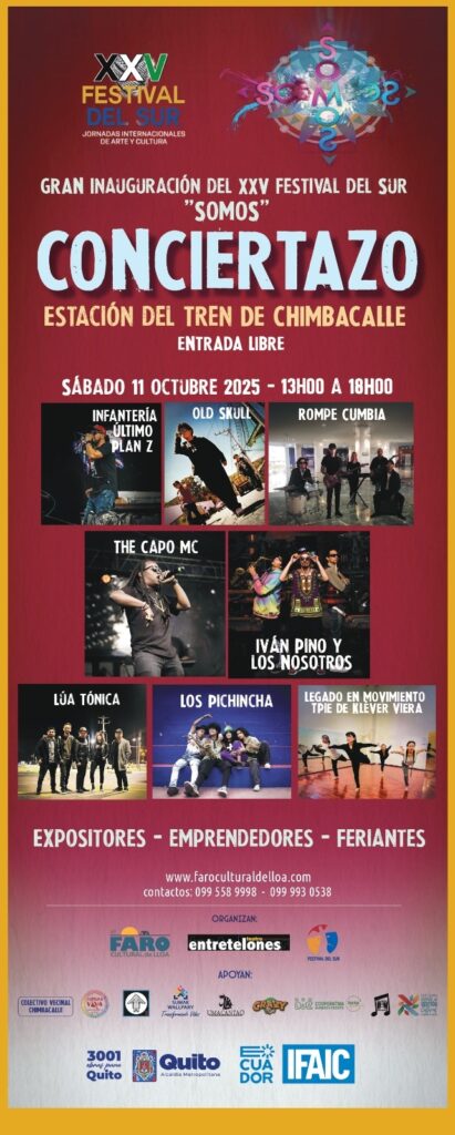 El Festival del Sur 2025 se llevará a cabo del 15 de octubre al 30 de noviembre de 2025 en Quito y otras ciudades del Ecuador, reuniendo a artistas, colectivos y proyectos de distintas latitudes en un diálogo vivo de arte, cultura y comunidad.